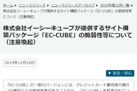 出典:株式会社イーシーキューブが提供するサイト構築パッケージ「EC-CUBE」の脆弱性等について(注意喚起)