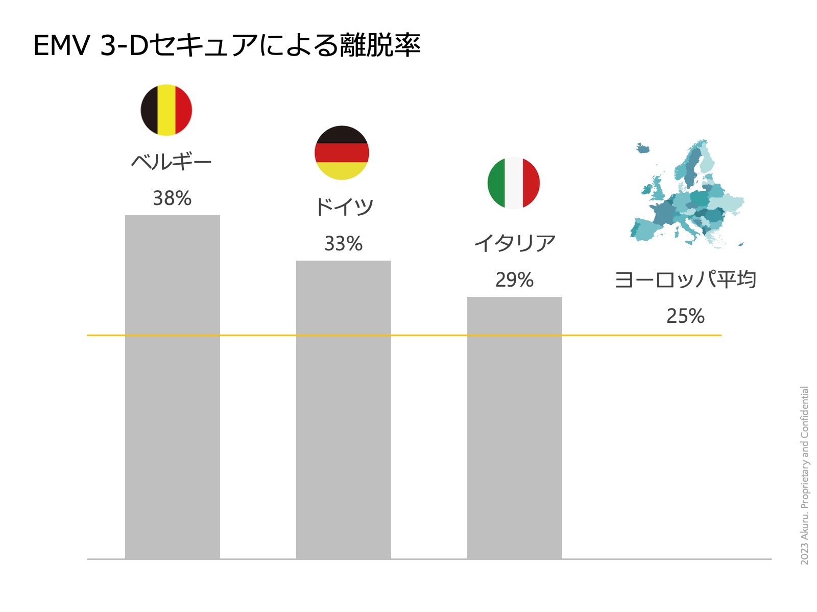 平均25%がヨーロッパにおけるカード決済の離脱率である、と推定したデータがあります。これは2021年6月に公開されたものであり、ヨーロッパでのEMV 3-Dセキュア義務化後の数字となります。主な原因はEMV 3-Dセキュアのパフォーマンス不良が影響しているものとしています。
