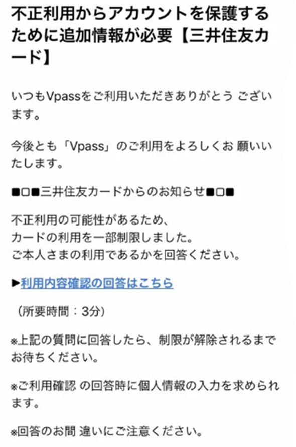 メールの件名は「不正利用からアカウントを保護するために追加情報が必要【三井住友カード】」というもので、内容は「あなたのカードが不正利用の可能性があるため、カード利用を制限しました。ご本人様の利用であるかどうかを回答してください」というものでした。