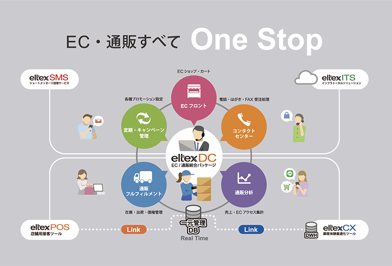 培ったECのノウハウに通信販売の管理を統合したEC/通販統合パッケージ『eltexDC』や、分析・プロモーション多機能ツール『eltexCX』、インフラトータルソリューション『eltexITS』、ショートメッセージ送信サービス『eltexSMS』などを取り扱っております。